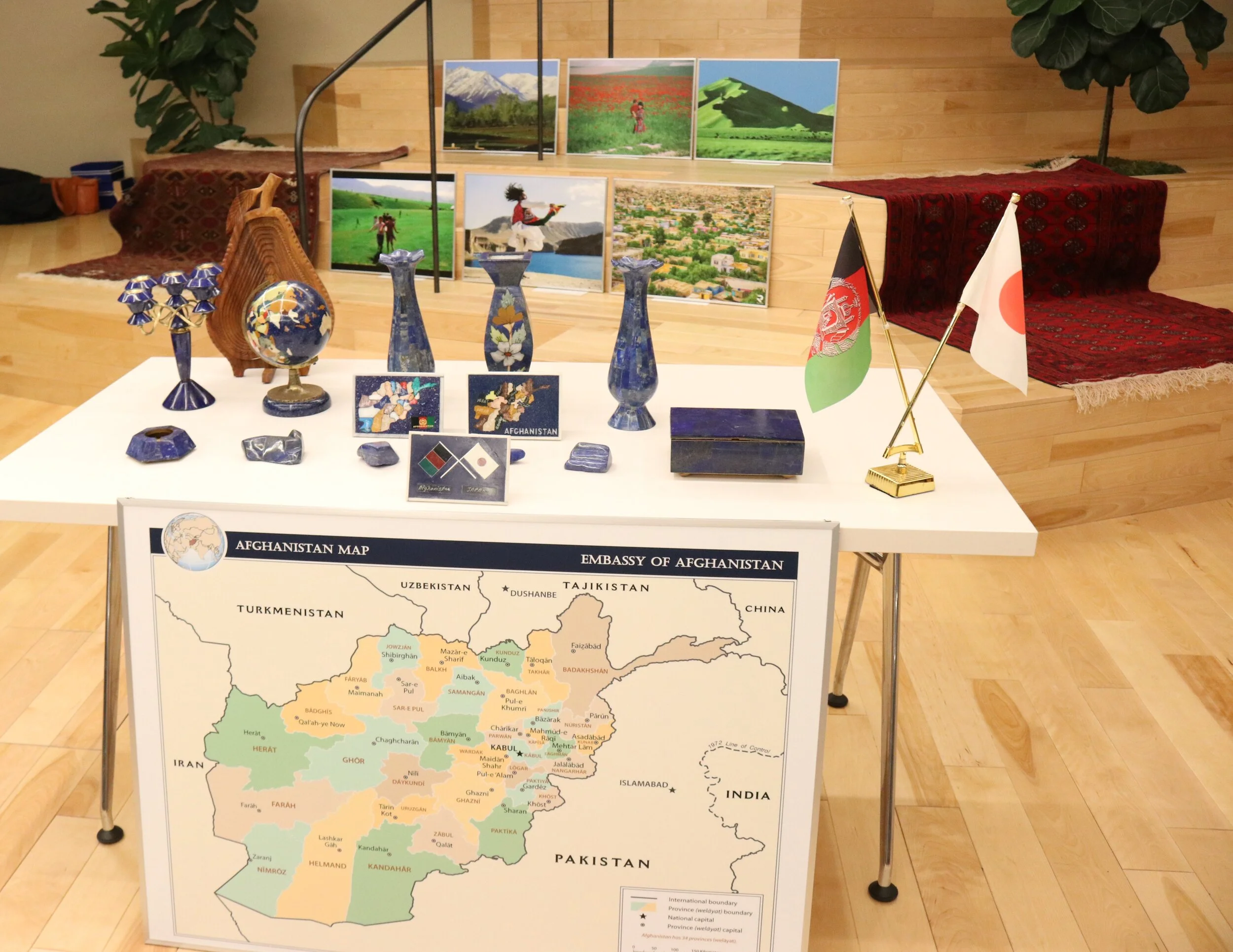 Carpets, pictures, maps, and other treasures from Afghanistan were on display, graciously presented by the Embassy of Afghanistan to Japan.